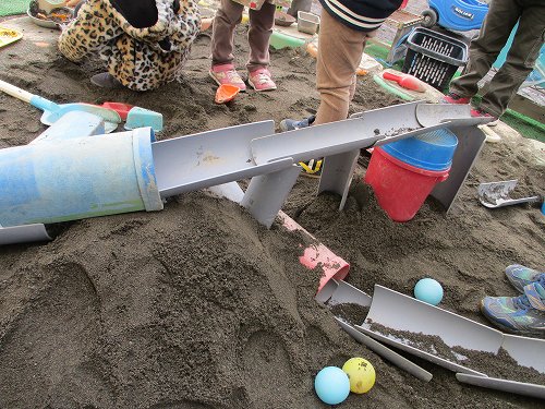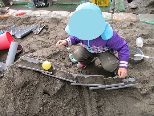 ボール転がしの装置が少しずつ大きなものに変化していき、山の上から転がしてみたり、室内で坂道を作ってみたり…と楽しんでいました。