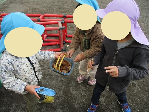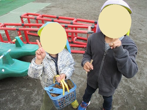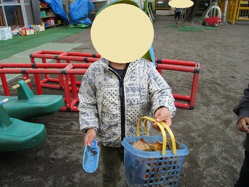 すると、かごを持った年少さんが「今ね、葉っぱ集めやさんやってるの!」と教えてくれました。
