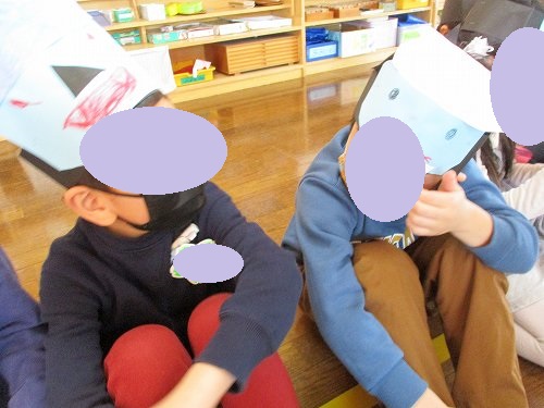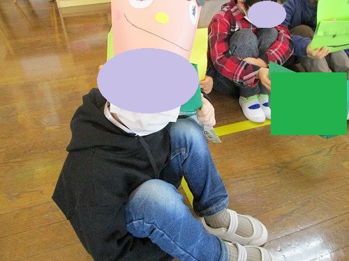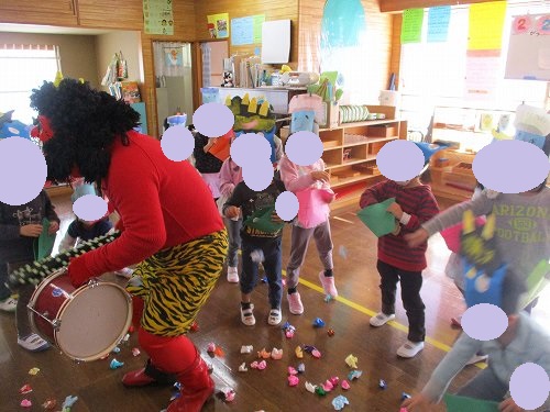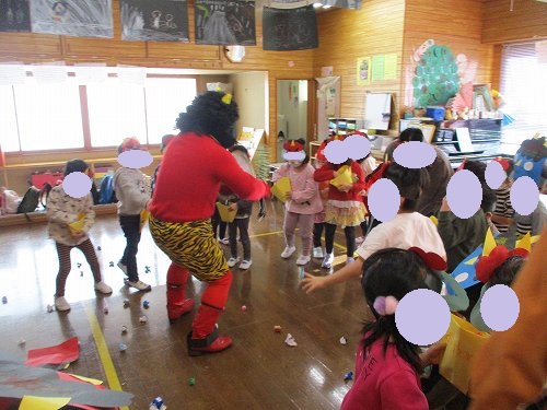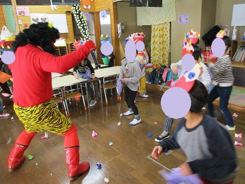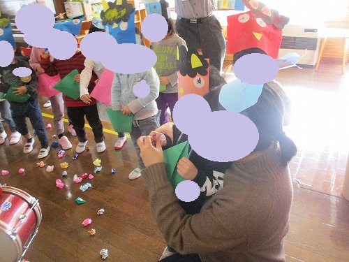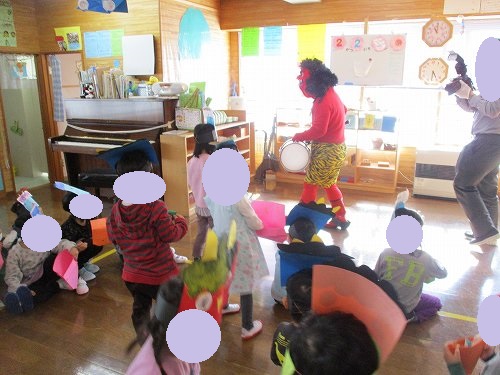 先生から節分の由来のお話を聞き、自分の中の「怒りんぼ鬼」や「泣き虫鬼」なども退治しようね!とお話をしているうちに、気づくと鬼さん登場!!