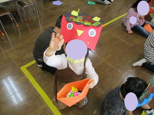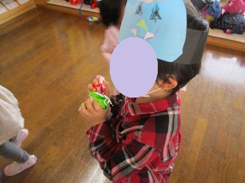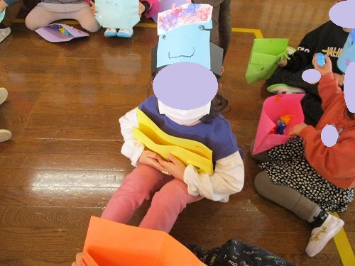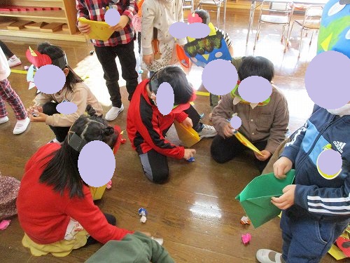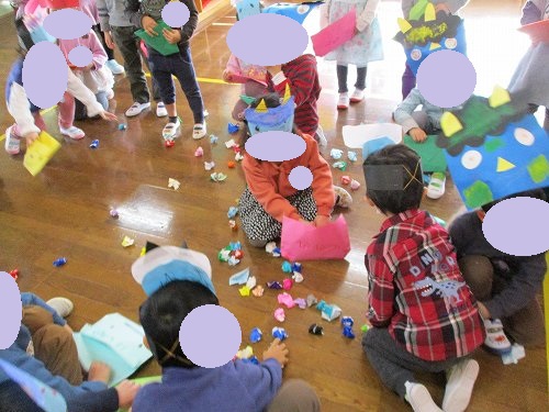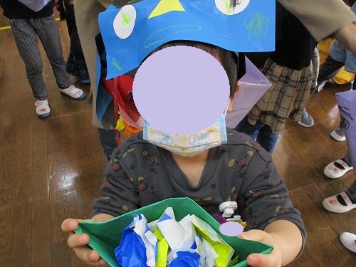 こちらの豆は、しわしわになった折り紙をみんなで丸めて豆を作りました☆