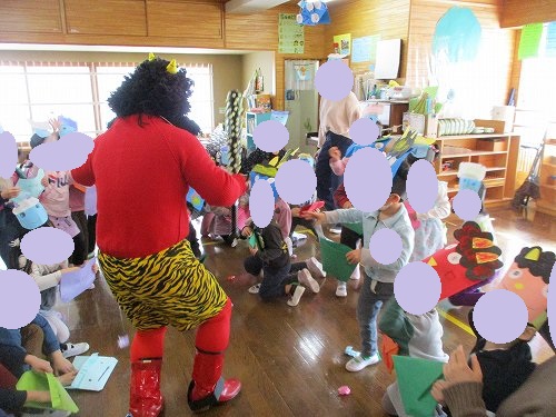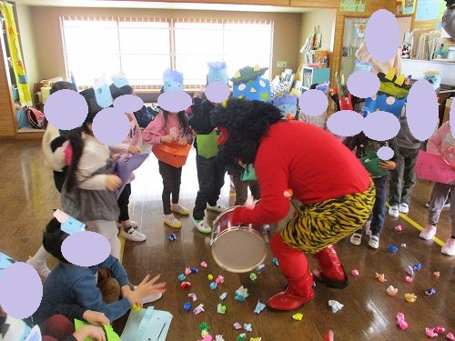 鬼さんにびっくりしたお友だちも先生と一緒に「えい!!」