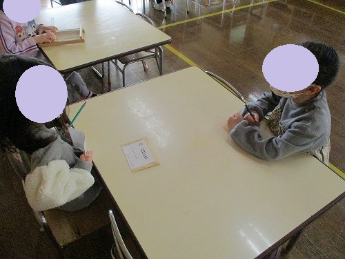 違うテーブルで書けば…?と思ったのですが、自分たちで「ここに座って書こう!」と相談しあっていたので、そっとしておきました。