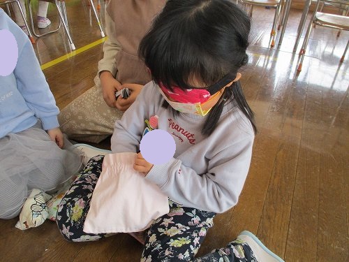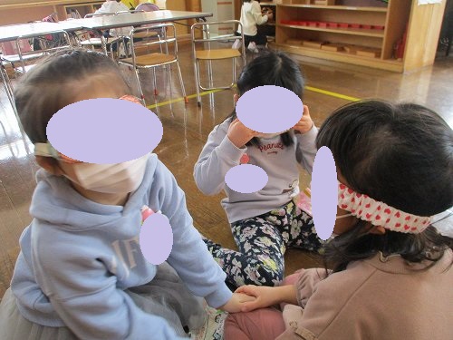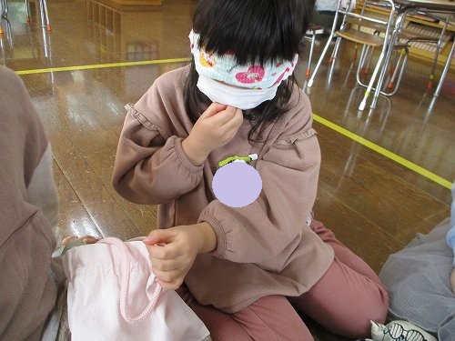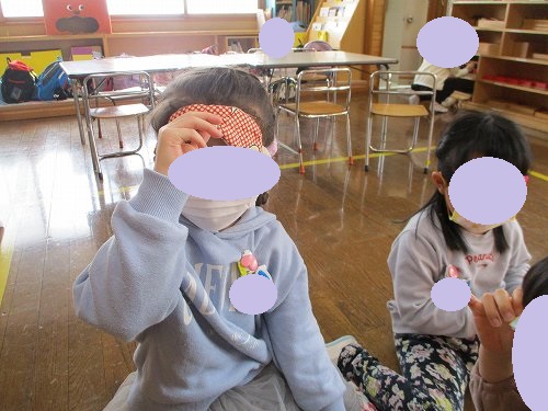ひみつ袋はアイマスクを付けて、袋の中に何がはいいているのかをあてる遊びです。
