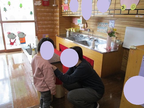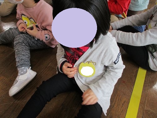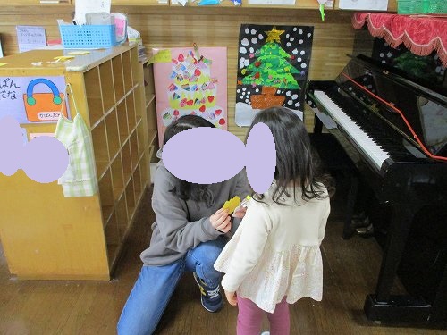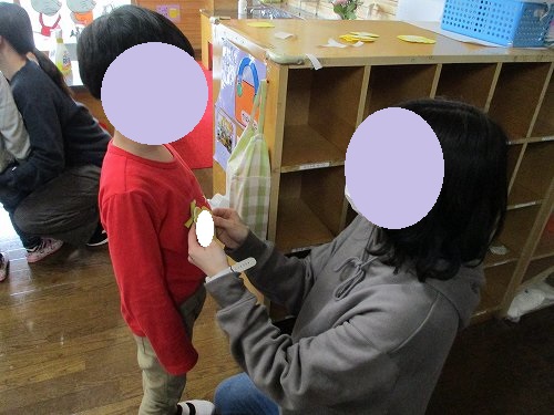 こちらはバッジ(画用紙で作ったちゅうりっぷバッジ(年中バッジ))を付けてもらっている年少さんの様子です!