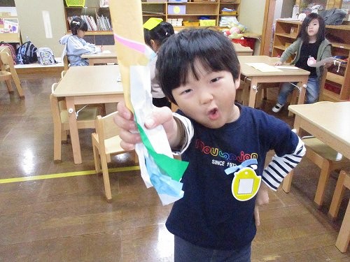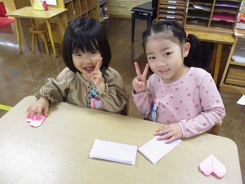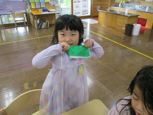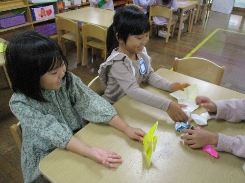 年長さんに折り紙の織り方を教えてもらってにっこりな年少さん☆