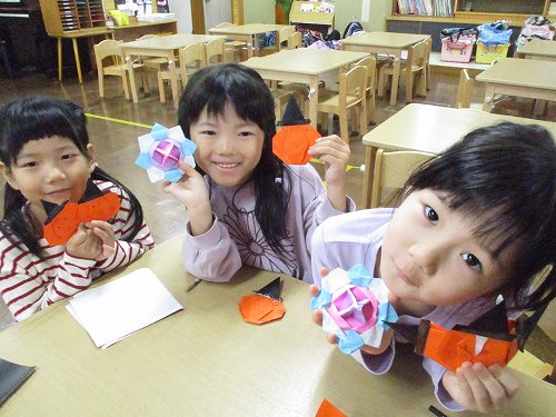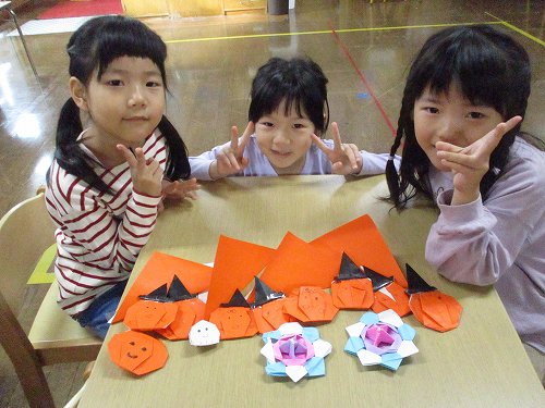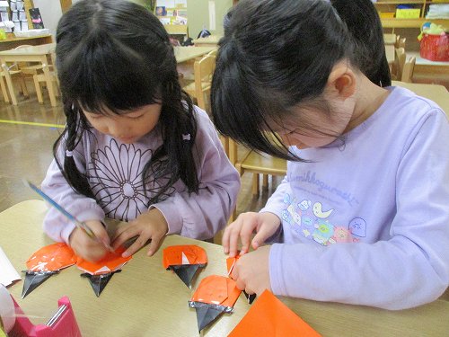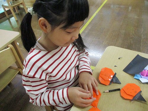 こちらの年長さんたちはハロウィンが近づいてきたこともあり、せっせとかぼちゃづくりに大忙し!