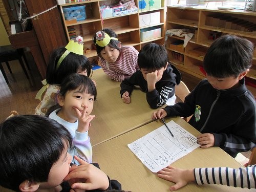 昼食後にみんなで集まり、「どうしよう?」「何にしよう?」と考えています。