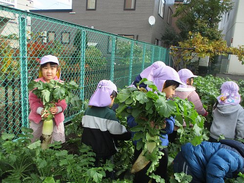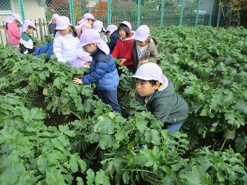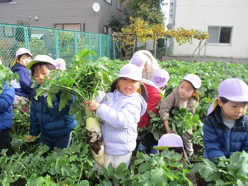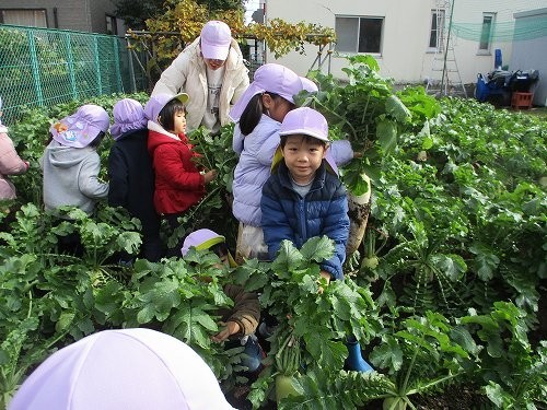 今回は幼稚園の園庭の畑で大根抜きをした様子をお届けいたします!