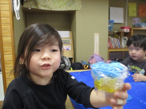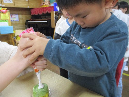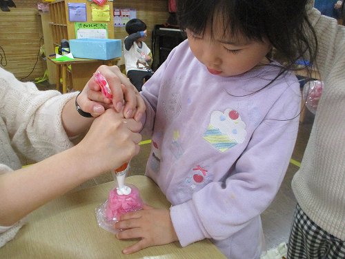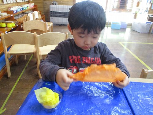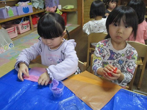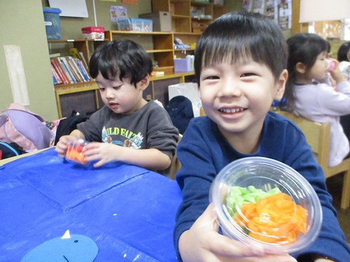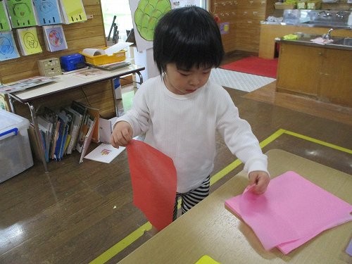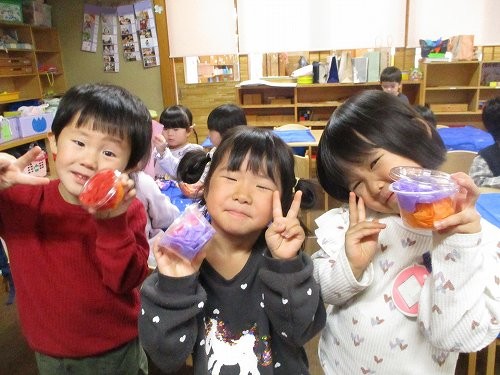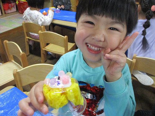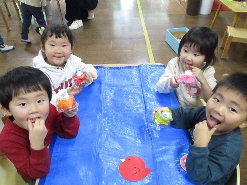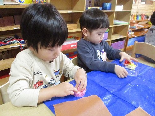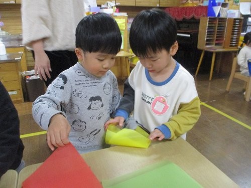 今回は年少さんのお店屋さんごっこの商品作りの様子をお届けいたします。