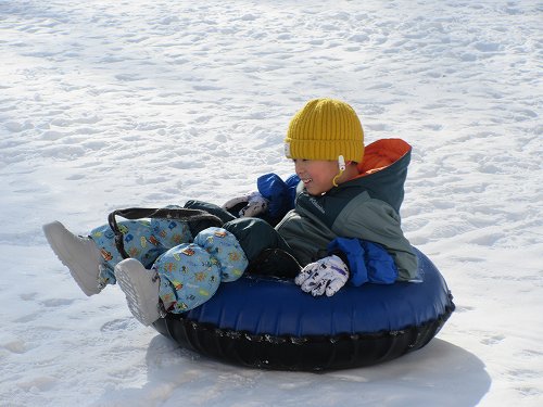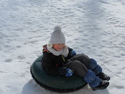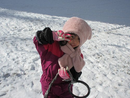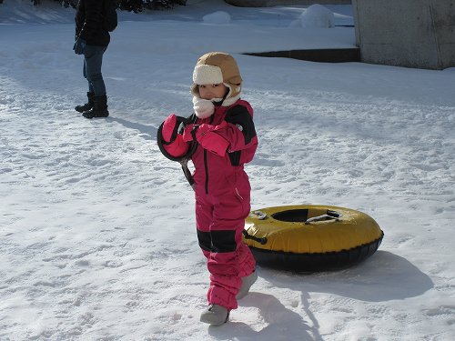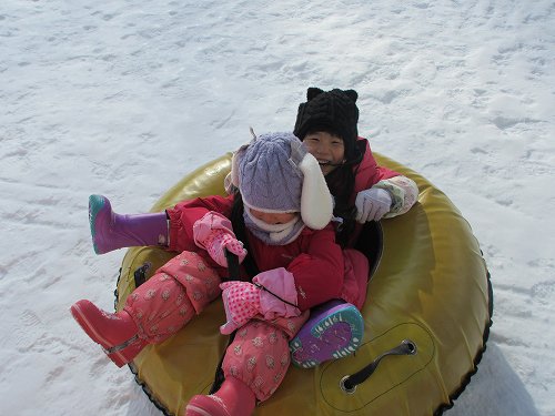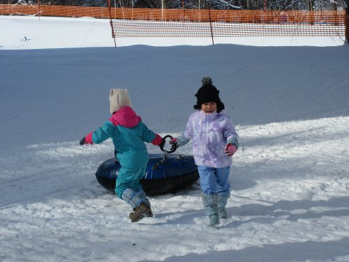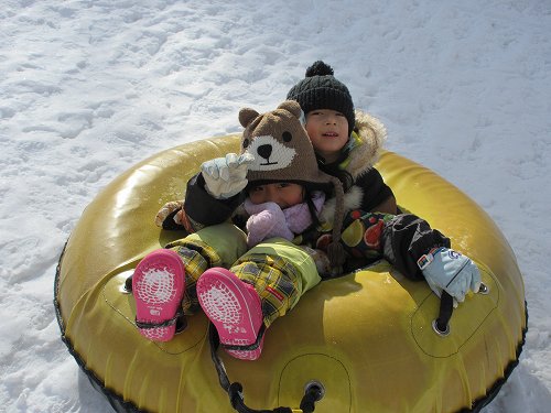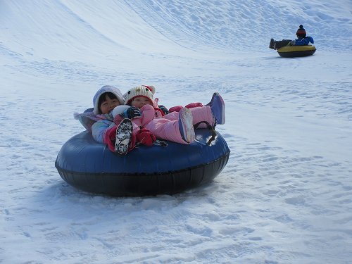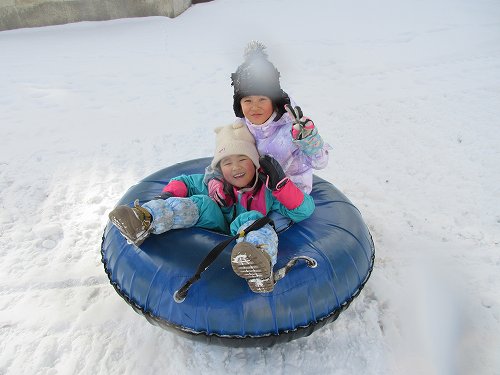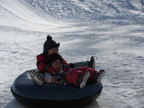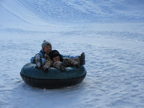 滑り終えたらまたチューブを引っ張って山の上まで駆け上ります!