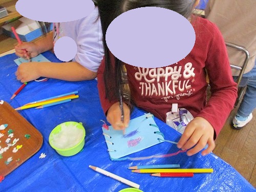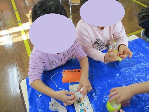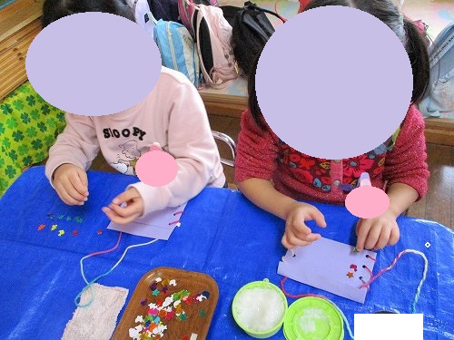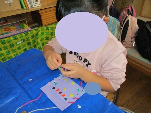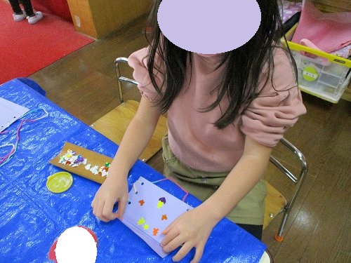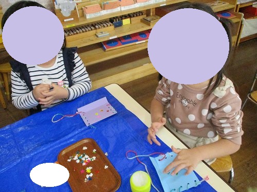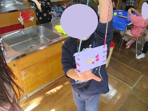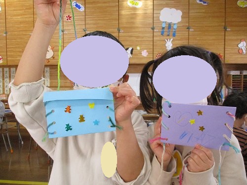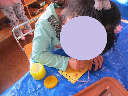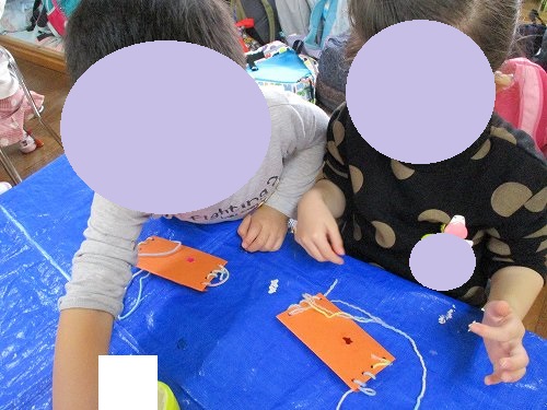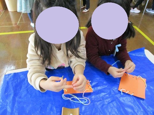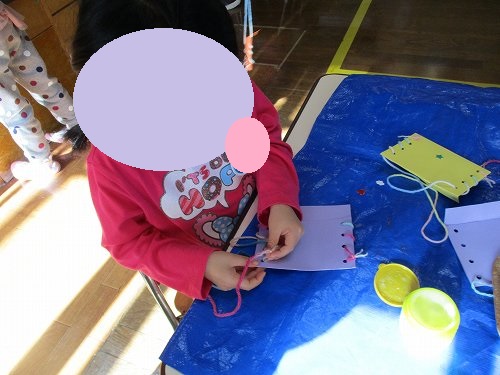 小さい穴に毛糸を通すのはなかなか難しいのですが、みんな頑張っていましたよ!