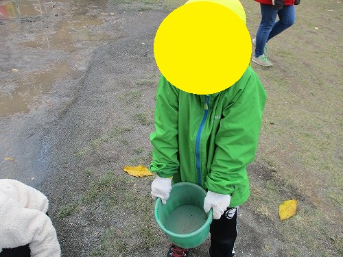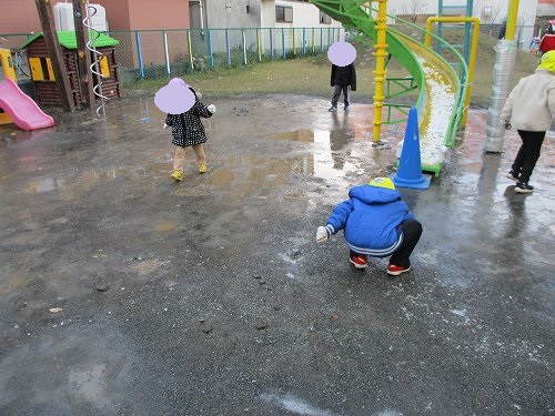こちらは前日の雨で園庭に大きな水たまりができていた様子です。
