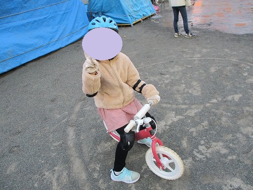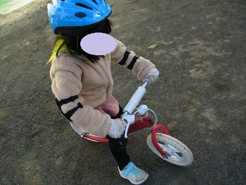 腕と膝にガードを付けて、ヘルメットを装着してキックバイクに乗っていますよ!