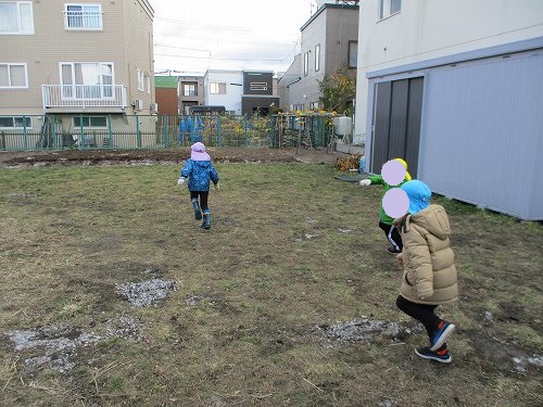 外が寒くても子どもたちは元気いっぱいに園庭で鬼ごっこやかくれんぼ、だるまさんが転んだなどをして遊んでいます♪