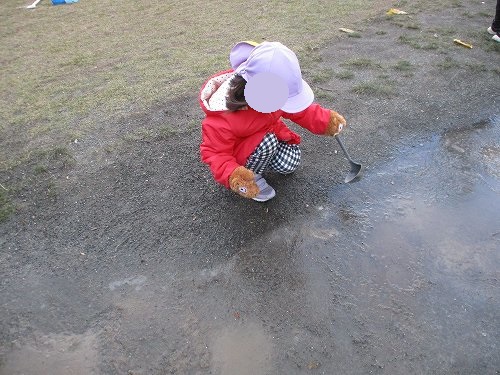 「あ!凍ってる!!」と水たまりが凍っていることを発見した子どもたちは大喜び!