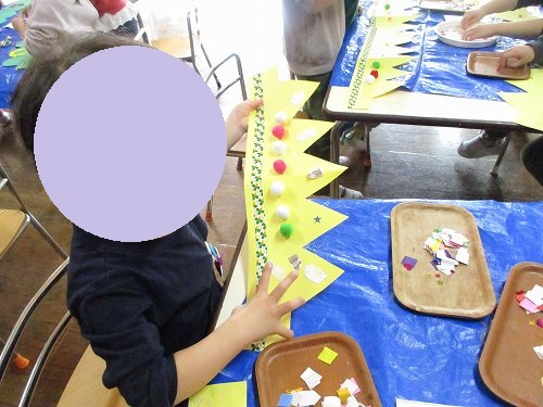 ポンポンをまっすぐに並べてみたり、折り紙でカラフルにしてみたり…☆
