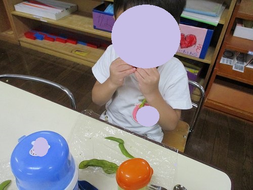 〇えだまめ収穫〇 2022年8月31日 本日は園庭になっていた枝豆の収穫をみんなで行いました! 残念ながらの雨模様だったので、テントの下で一つずつ枝豆をとりましたよ! 「うーん、なかなか取れないなぁ。」 「枝豆をぜーんぶとるよ!!」 カメラに向かってニッコリ☆ とれた~! 大きい鍋にいっぱいの枝豆!鍋2つ分の量でした! みんなで収穫した後は茹でてお昼ご飯と一緒に「いただきまーす!」 「おいしーい!」と嬉しそうな子どもたちでした♪