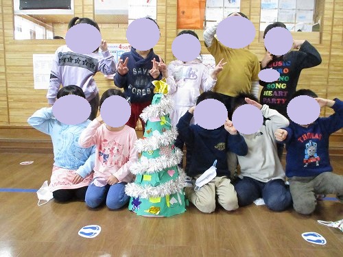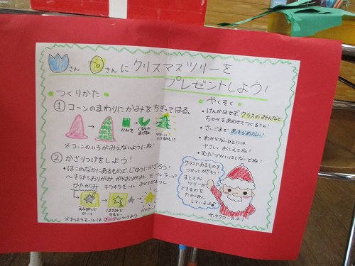 後日、縦割保育の日に年長さんから各クラスのお友だちに素敵なクリスマスツリーのプレゼントを渡しました!