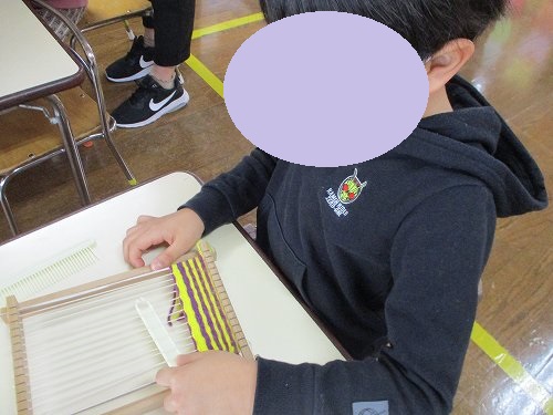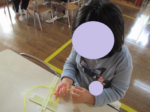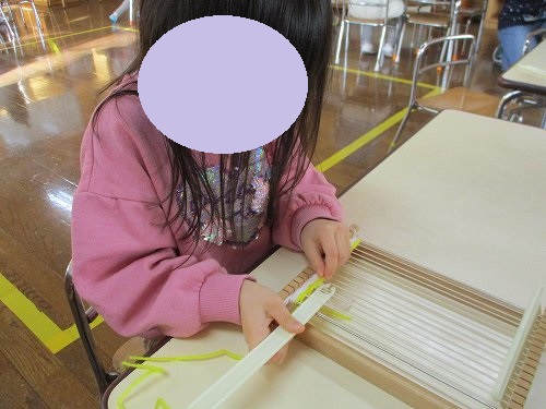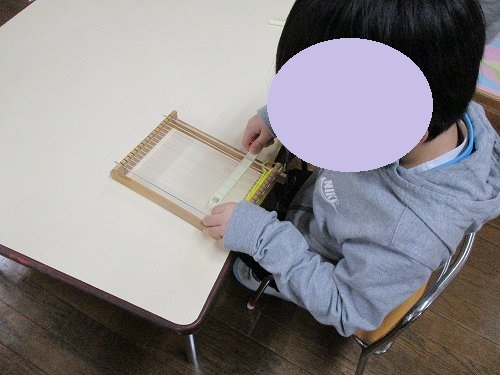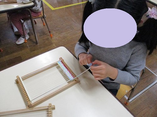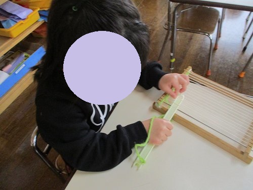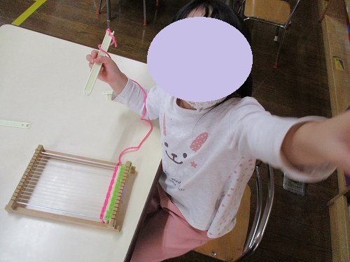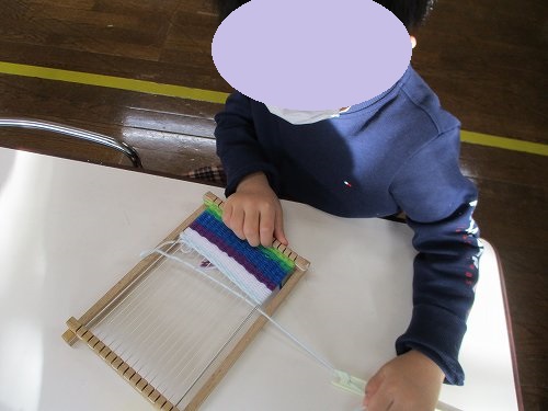 今年初めて毛糸の機織りを経験する年中さんは、毛糸をひに通す・毛糸を結ぶ・編む…というたくさんの作業に苦戦しながらも頑張って取り組んでいました!