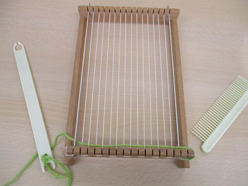 『機織り機』と、くしのような形をした『おさ』、毛糸を編んでいく道具の『ひ』を使って機織りを行っていきます。