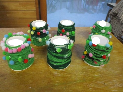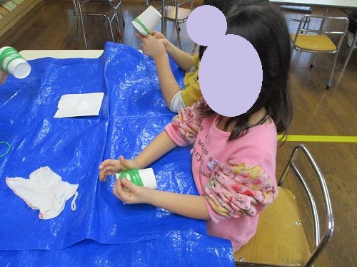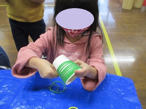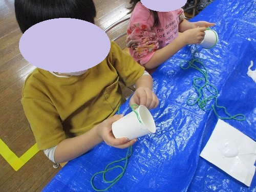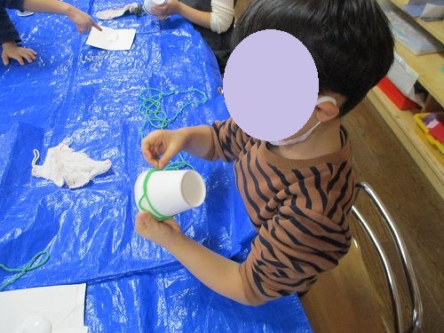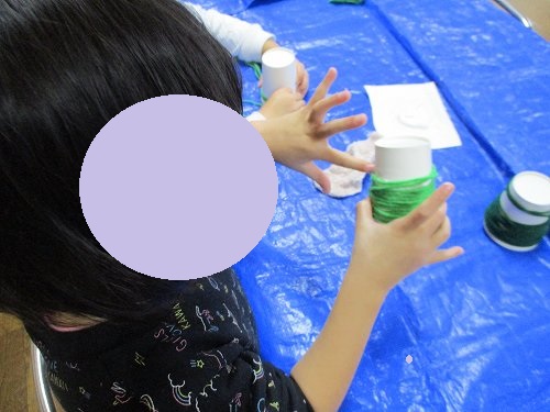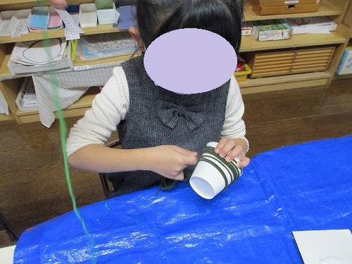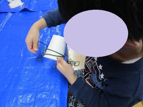 ボンドで毛糸の端を紙コップにつけてクルクル…