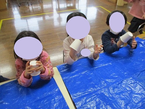 紙コップを持って嬉しそうな子どもたち。