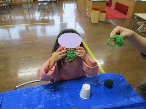 材料の毛糸をもらい、サンタさんのおひげの真似をするおちゃめな子もいました☆