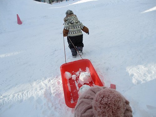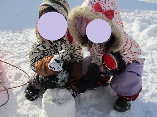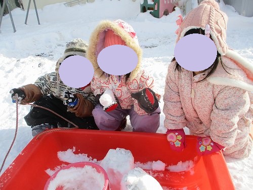 バケツに雪を詰めてひっくり返し、大きな大きなイチゴケーキを作りました♪