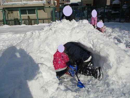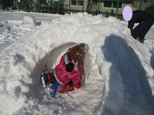 みんなで固めた雪山を頑張って掘り進めて、徐々にかまくらのようになってきました!